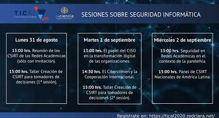 Te invitamos a participar en las Sesiones de Seguridad Informática que se realizarán en el marco de TICAL2020 y el 4° Encuentro Latinoamericano de e-Ciencia, entre el lunes 31 de agosto y el miércoles 02 de septiembre, de manera virtual y gratuita.