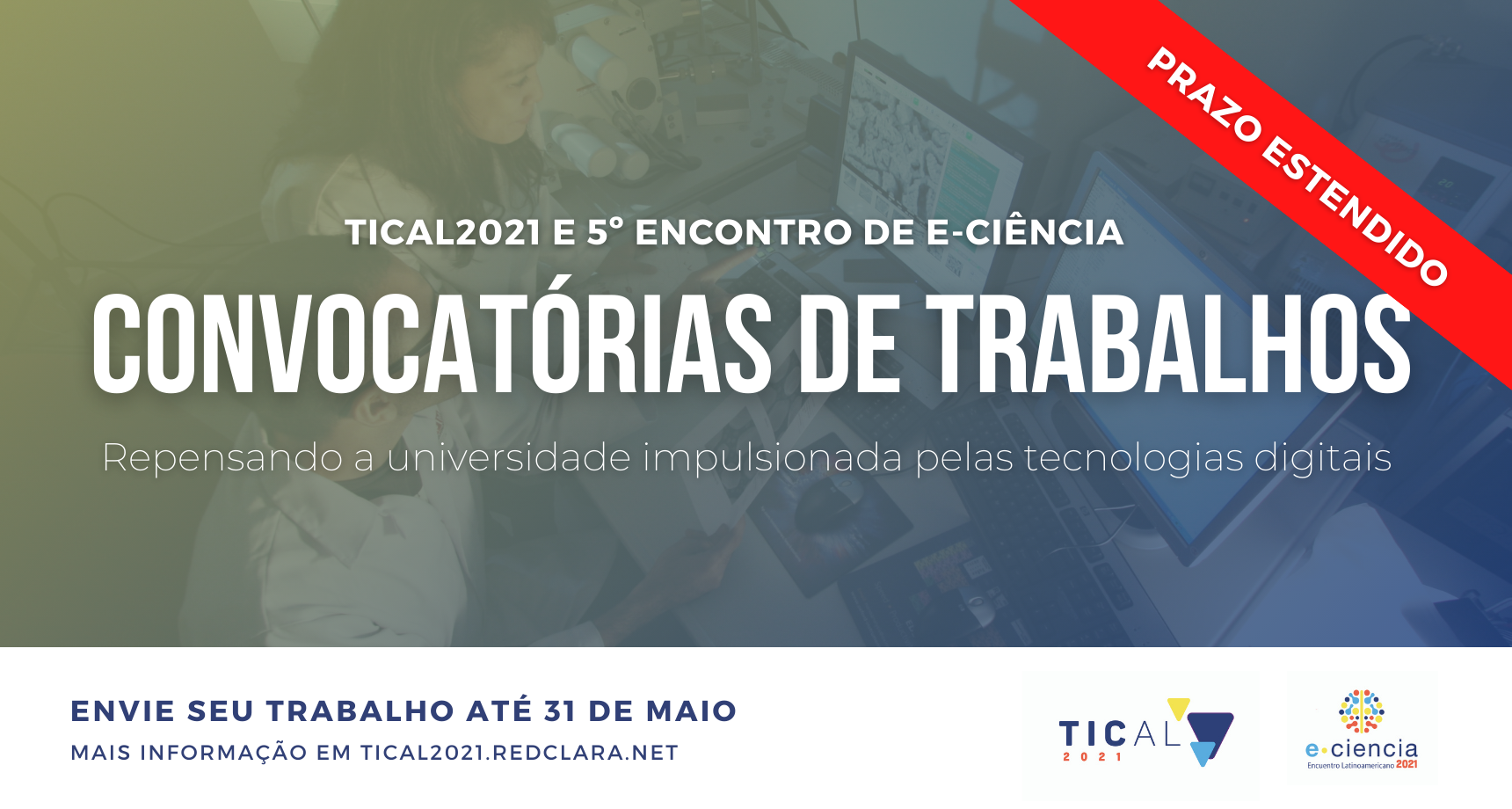 O prazo para postular e participar como autor em TICAL2021 e no 5º Encontro Latinoamericano de e-Ciência se encerra no dia 10 de maio de 2021.